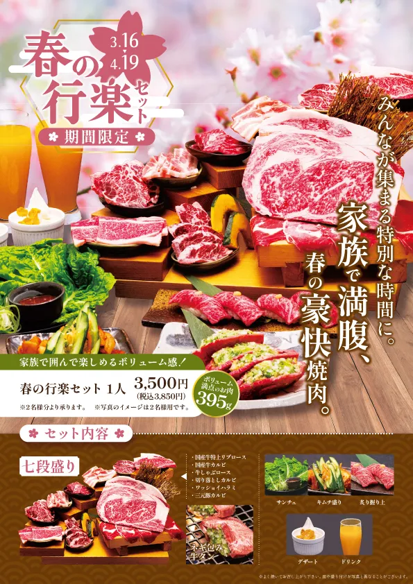 春の行楽セットは、ご家族やグループで焼肉を思いきり楽しんでいただけるよう考えた期間限定メニューです。